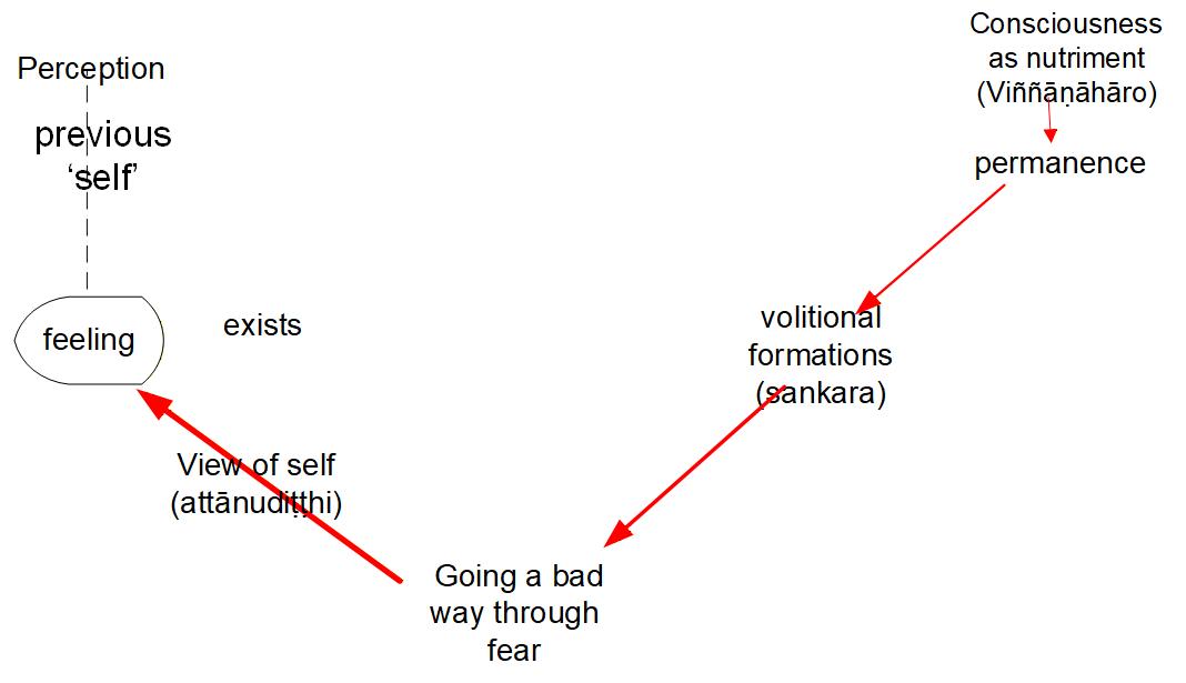 Here I remembered the dhamma points of the 03/10/2015 Sakkaya Ditti meditation. By means of a path like the path shown there, that is consciousness, permanence (nicca), volitional formations (samskara), ‘going a bad way through fear’ (bhaya agathi), to feeling (vedana), the notion of ‘exists’ is arrived at. See diagram 1 given.