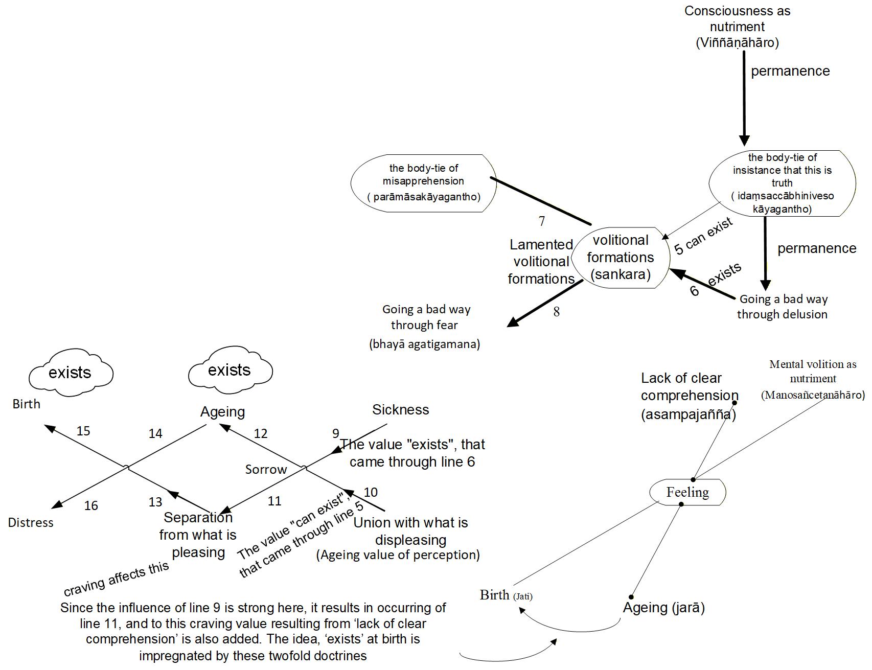 (*5) We have given a diagram there. There you can see the line ‘ageing-feeling- lack of clear comprehension’. By the rotation of it, going from ageing to birth. We have also written a sentence there. Since the influence of line 9 is strong here, it results in the occurring of line 11, and to this craving value resulting from ‘lack of clear comprehension’ is also added. The idea ‘exists’ at birth is impregnated by these twofold doctrines. So, one can write it there, underneath ageing ‘separation from what is pleasing’. It can be written there within brackets, 3a. Next, at the place called ‘lack of clear comprehension’ (asampajāna), you can put a curved arrow above it and write it as craving on the right side. There, you write 3b, then it is very clear. Then, it is seen this way that the idea ’exists’ occurs due to craving.