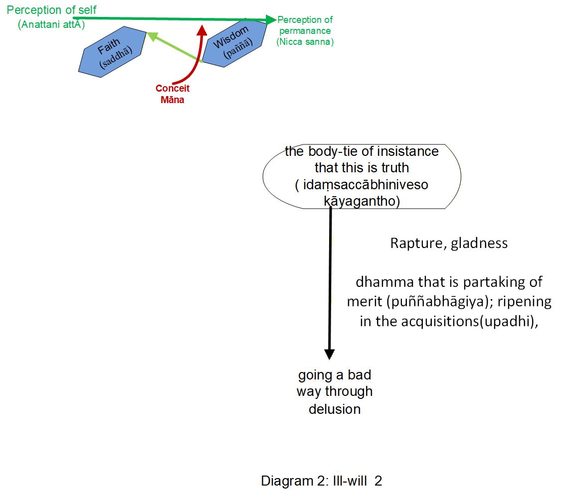 From ‘insistence that this is truth’ (idamsacca), flowing downwards, dhamma that is partaking of merit (puññabhāgiya); ripening in the acquisitions (upadhi). Before that, there is the doctrine of self (atta) to permanence (nicca) lifted by conceit (mana). If it cannot be conceited for the doctrines that is partaking of merit (puññabhāgiya); ripening in the acquisitions(upadhi), then knowing that the bridge from ‘self’ (attā) to ‘permanency’ (nicca) cannot be maintained in some manner, if some effort should be made for it, if it cannot be accomplished, one falls into ill-will (byāpāda). It was learned that if one cannot carry out such a process well through 'stinginess regarding doctrine’ (dhammamacchariya), then a nature of ill-will (byāpāda) arises towards the phenomena related to feelings (vedanā).