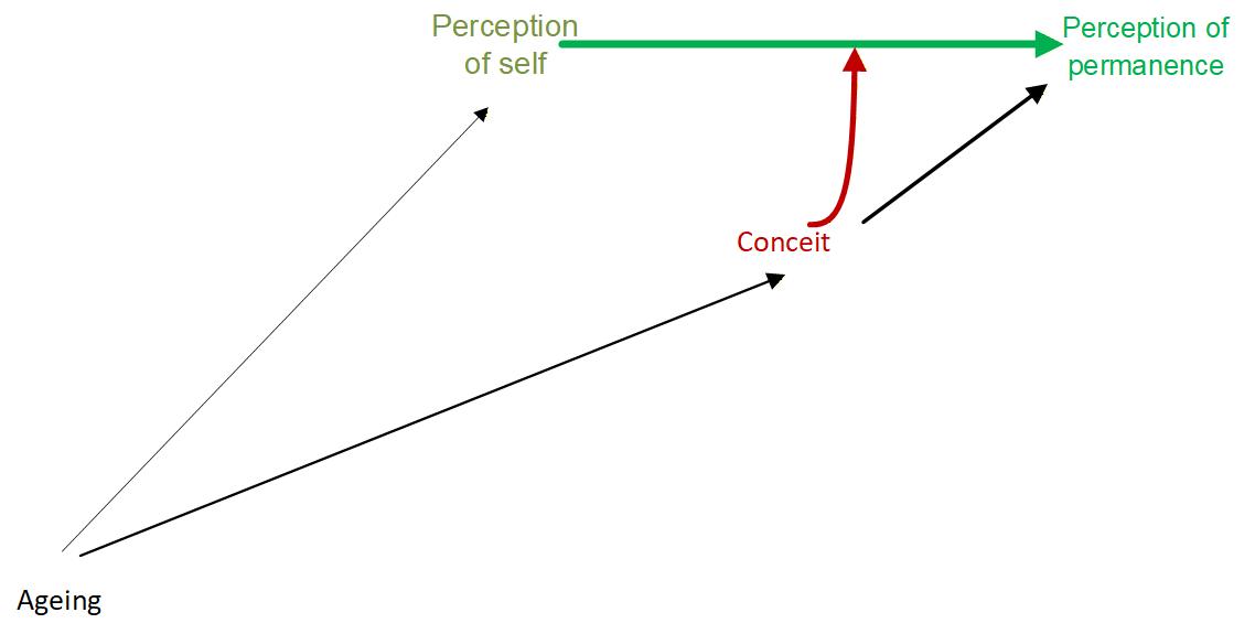 If one takes the constantly aging form as self, suffering is contained within that self. If one has conceit (māna) for the constantly aging form, suffering is contained within that conceit. Thereby if one takes the constantly aging form as permanent, suffering is contained within that too. One way is the arising due to the present-self. Even if the present-self has disappeared even if it is not grasped, this can still happen together with conceit due to the previous-self. See this with the first diagram given in the Vimutti meditation on 01/10/2015.