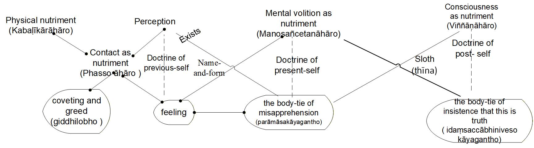 In the diagram, the doctrine of previous-self is marked between perception (sañña) and feeling (vēdanā). The doctrine of present-self is marked between mental volition (manosañcetana) and the body-tie of misapprehension (parāmāsakāyagantho). The doctrine of post-self is marked between consciousness as nutriment (viññana ahara) and the body-tie of insistence that this is truth (idaṃsaccābhiniveso kāyagantho).
