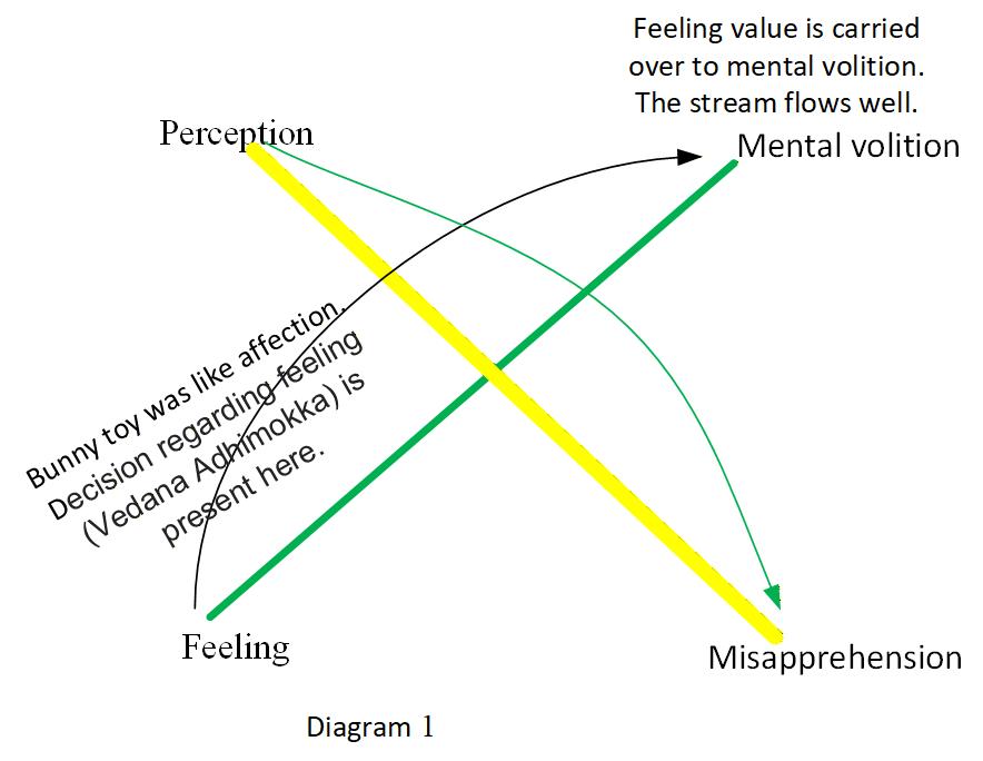 5. In the 10/11/2023 adhimokka meditation the ideas associated with feeling (vedana dhamma) that exists with “bunny toy was like affection” should not be exceeded. That is, it is also accepted as necessary. The ideas associated with feeling that exists later should not be exceeded. Having thought like this, the decision was taken to separate from the bunny was investigated. Therefore, as stated in point 4 above, by offering alms (dana), virtue (sila), and meditation (bhāvanā) are undertaken without wisdom (paññā), one is seeking for both, present ideas associated with feeling (vedana dhamma) and the ideas associated with feeling that exists later that are based on past ‘volitional formations’ (sankhāra).