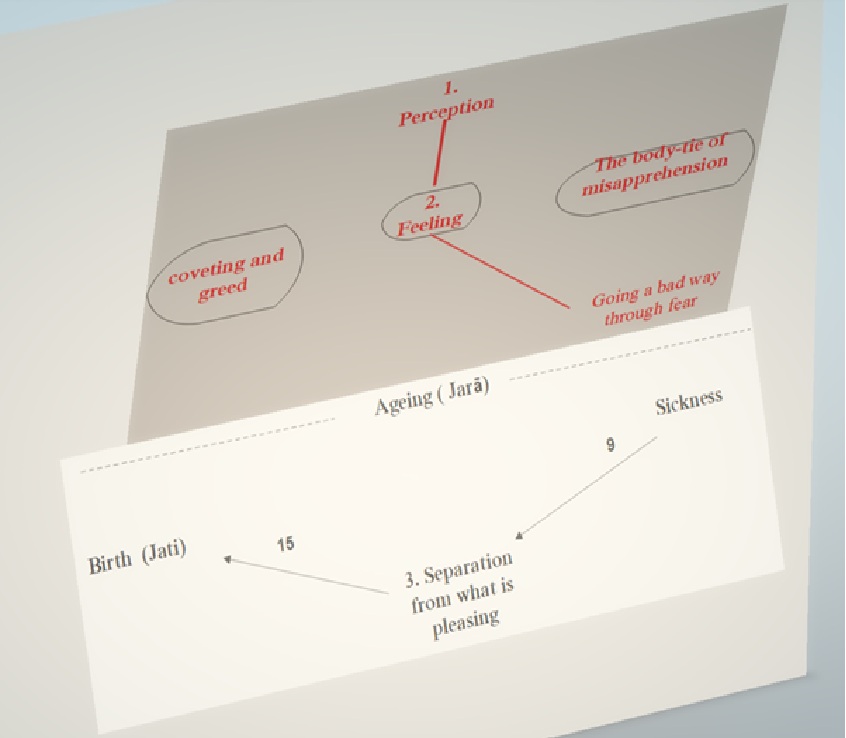 3. While ‘Repairing’, reflecting on ‘beauty plus permanence results in pleasure’ (subha + nicca -> sukha), recalling that within ‘delusion’ (moha) lies the ignorance for not-knowing that a doctrine beginning with ageing (jarā) leads to the ‘permanence’ (nicca), the ‘pleasure’ (sukha) does not establish in ‘right thought’ (sammā sankappa). The peaceful state that arose in point 2, continues without fading away.