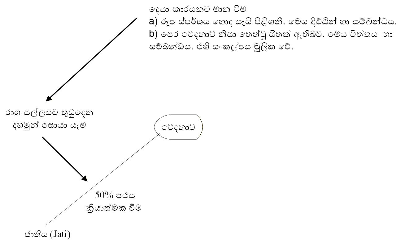 50% පථය, ඉන් අනතුරුව වේදනා තණ්හා චේතනා ඇති වීමත්, විඤ්ඤාණ ප්රත්යයෙන් දෙකළවරින් ඇතුල් වෙන ධර්මතාවයන් මගින් රාග අනුසය මගින් පවසන අදහස් වන තුන් අගයෝ, එනම් නාමරූප ඇති තැන සුභ අගය, පරාමාස ඇති තැන සුඛ අගය, රාග අනුසය හරහා චේතනාව දක්වා වූ මාන අගයෝ, යන අගයන් තුන ම ඇවිස්සීම. සටහන 2 බලන්න.